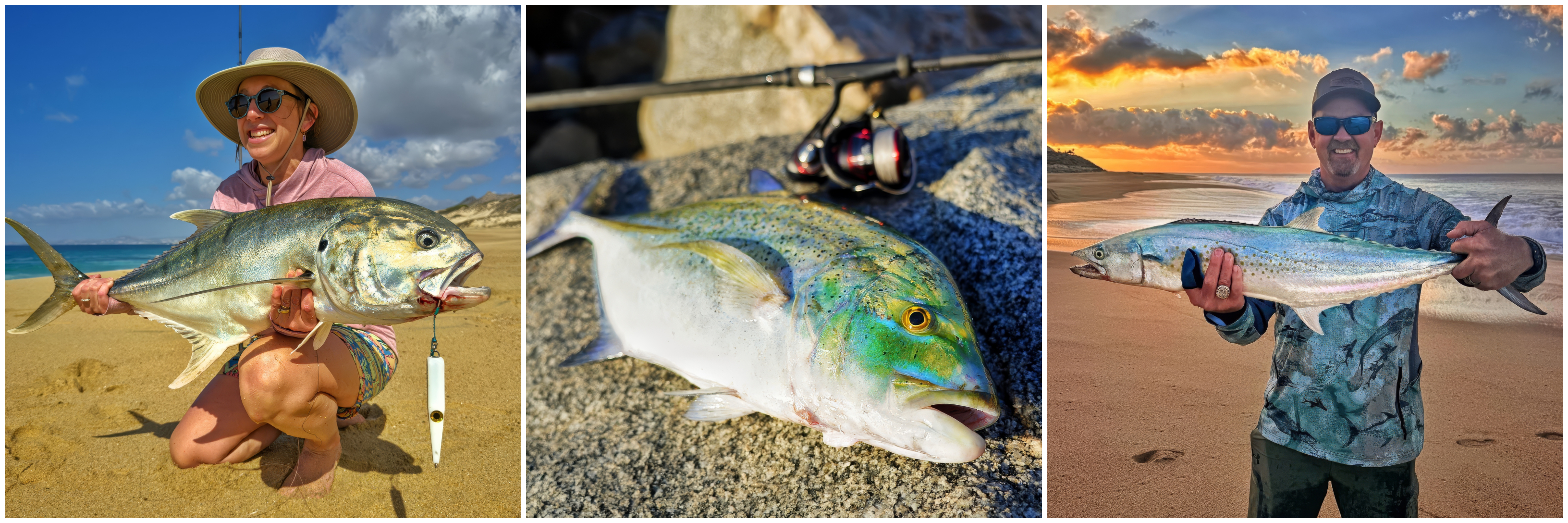 Cabo Surfcaster guide trip, left a Jack Crevelle, center a Bluefin Trevally,
