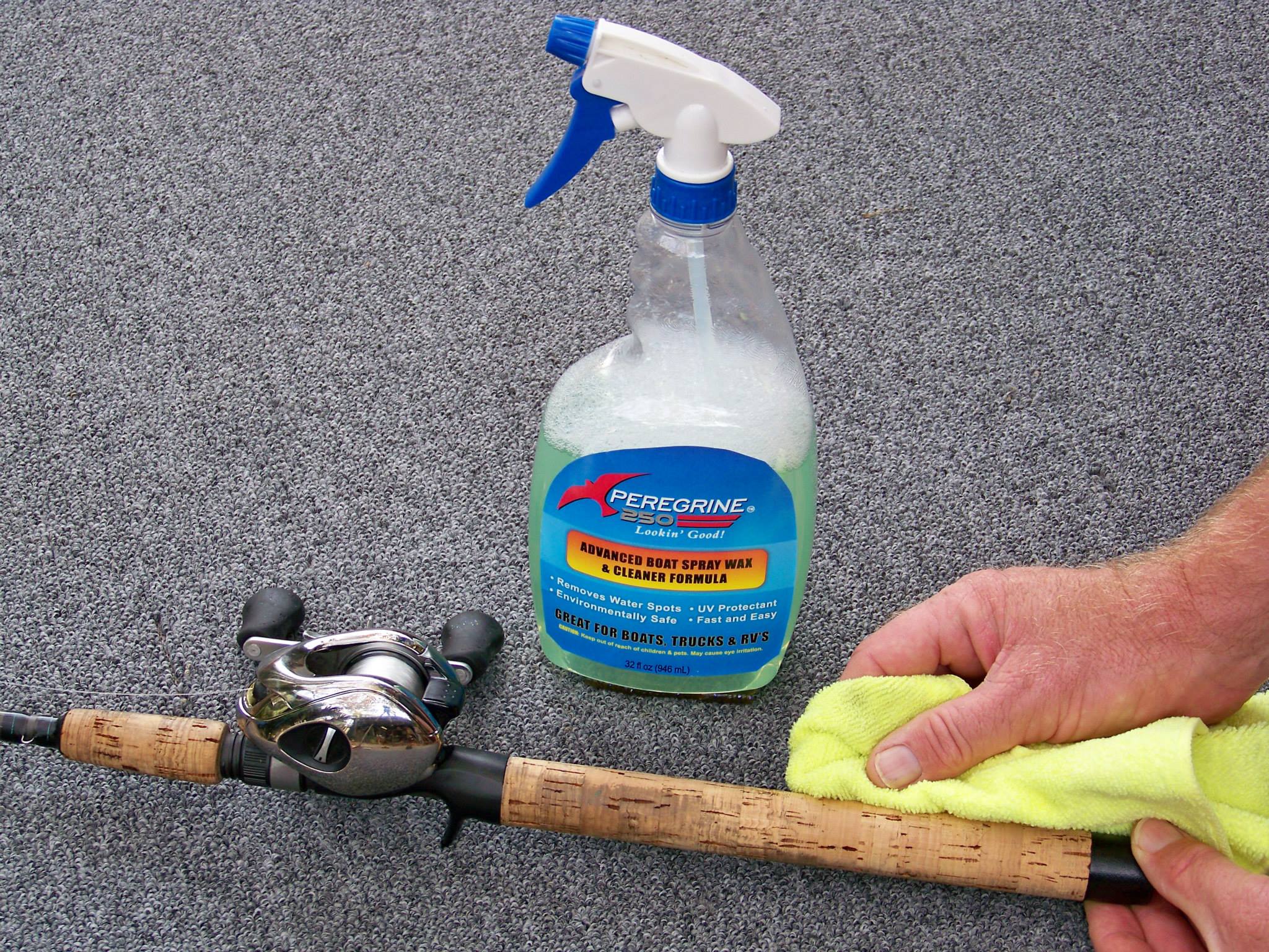 Cleaning cork rod handles is a breeze with Peregrine 250 Advanced Boat Spray and Wax Cleaner Formula.