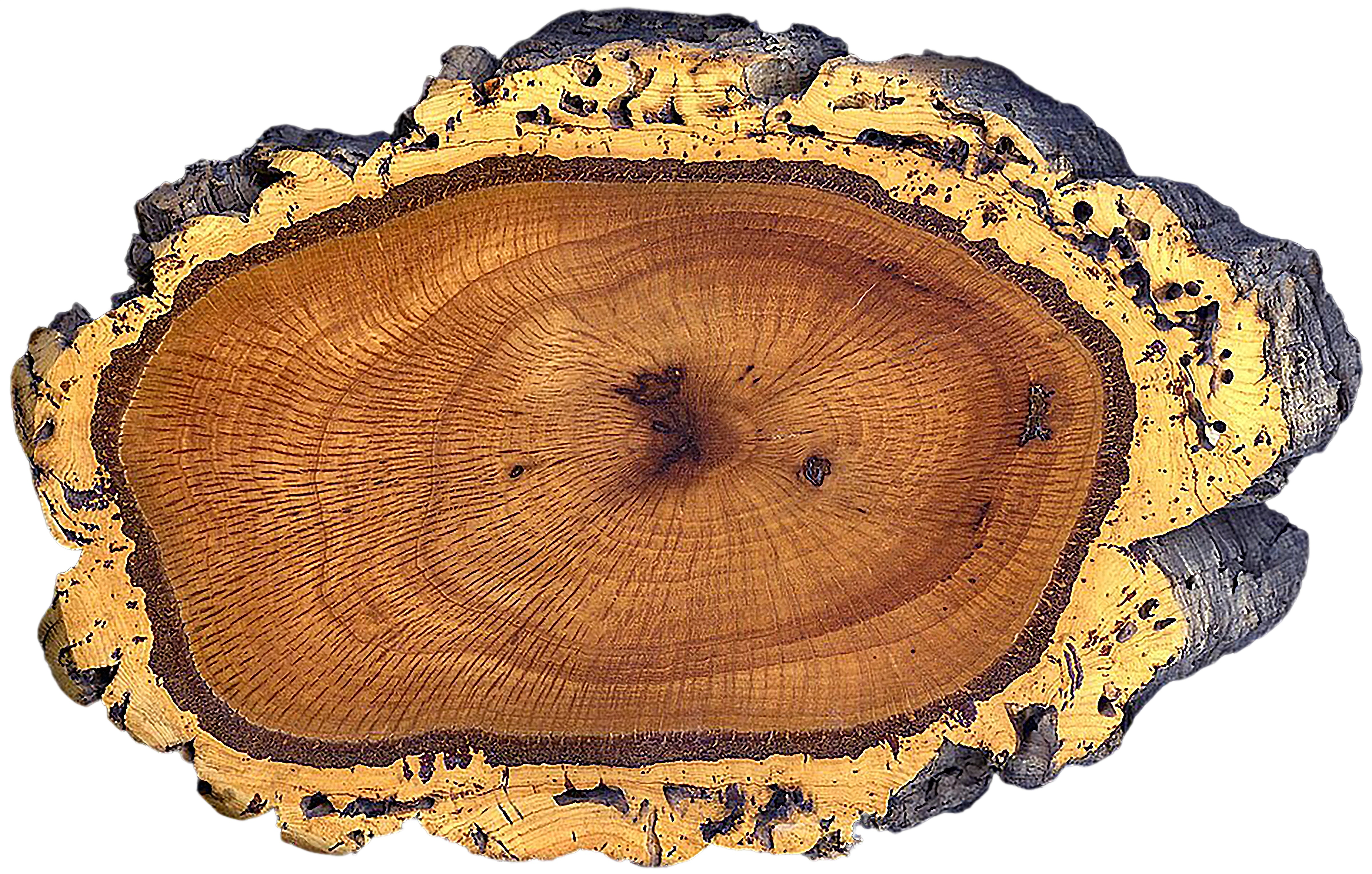 Quercus suber: A cross-section of a Cork Oak Tree trunk showing the outer bark, which is harvested for cork applications.