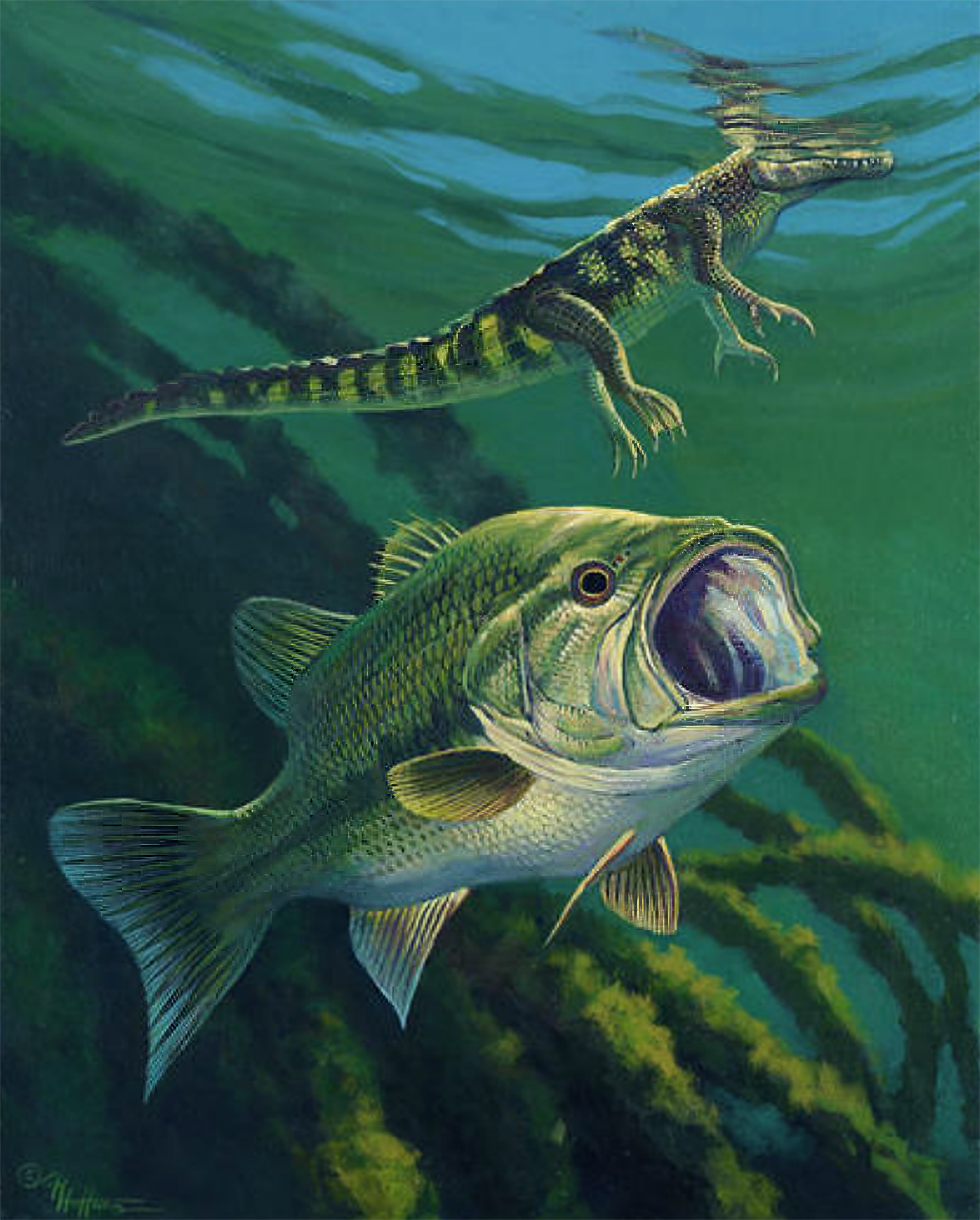 "Unaware" - Largemouth Bass and Baby Alligator.