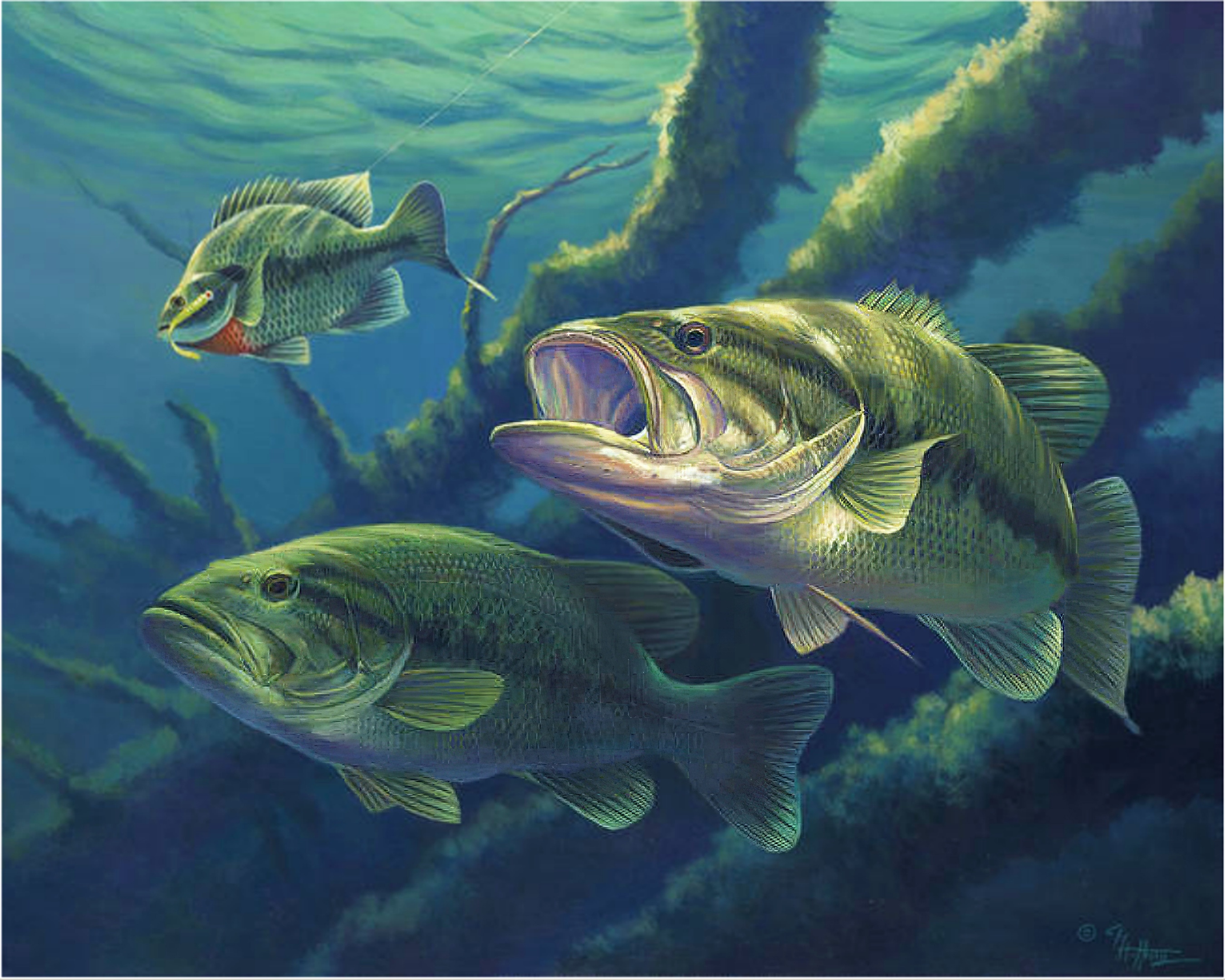 Michael Hoffman’s art pieces, which was the image above titled “Out of the Shadows.” I was immediately pulled into its depiction. Seeing the Bluegill on the line with the artificial