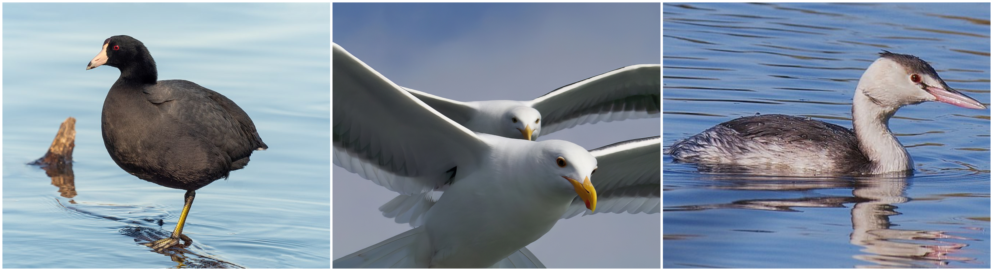 Left to right: An American Coot, a grass eater, Seagulls, and a