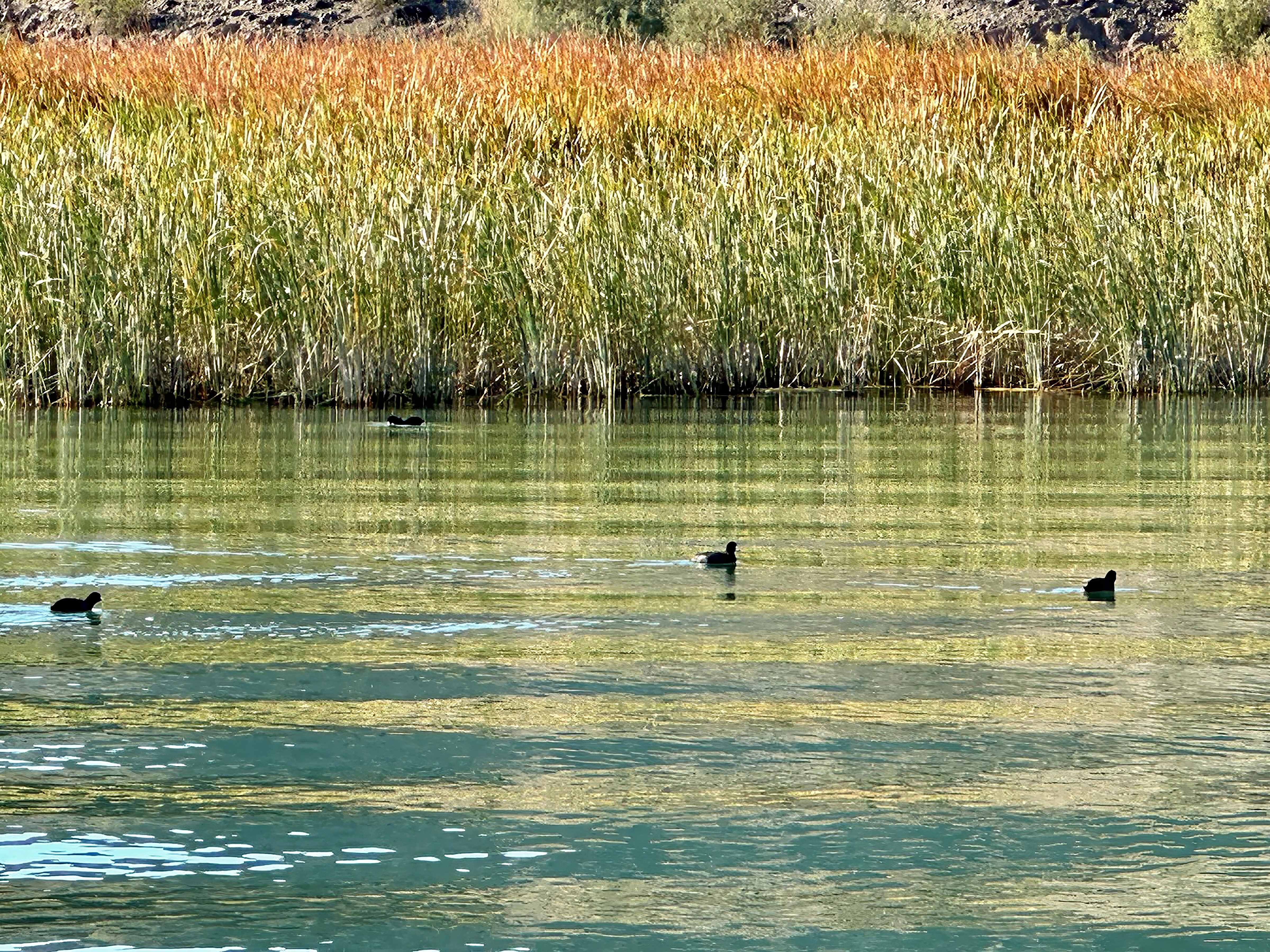 Coots, in front of the tulle shoreline, as in the previous image above. The